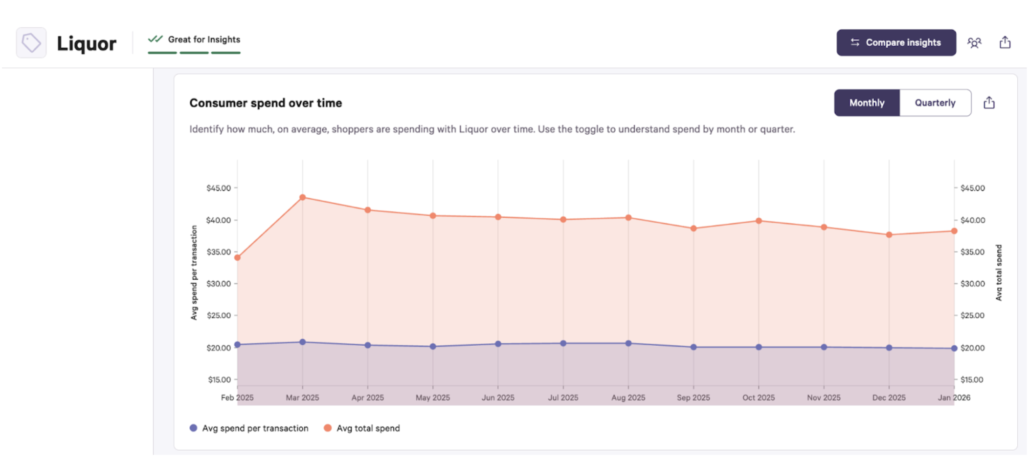 If Dry January is a movement, it's one that hasn't made it to the checkout counter. Attain's consumer spend data for liquor shows that average spend per month held remarkably steady throughout 2025 and into January 2026, hovering around $30 with no meaningful dip in the new year.