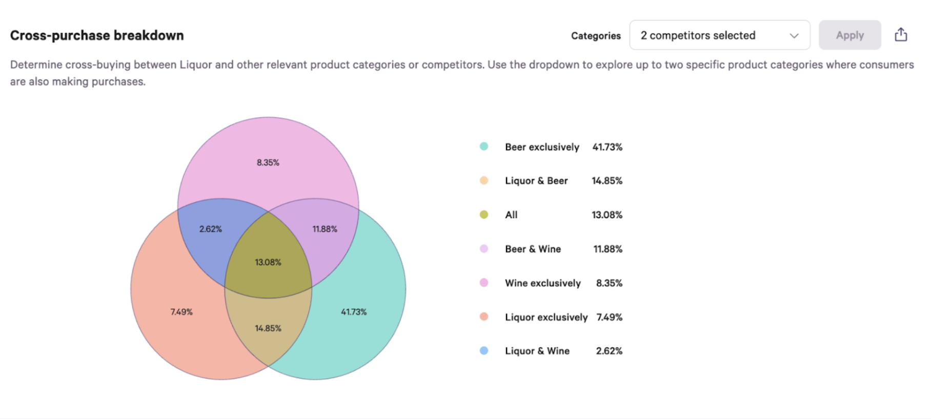 The cross-purchase breakdown reveals just how siloed beer drinkers tend to be. Of the consumers analyzed, 41.73% buy beer exclusively, by far the largest single segment. Only 14.85% buy both liquor and beer, and just 13.08% buy across all three major categories (beer, wine, and liquor). Wine-exclusive buyers account for 8.35%, and liquor-exclusive for 7.49%.